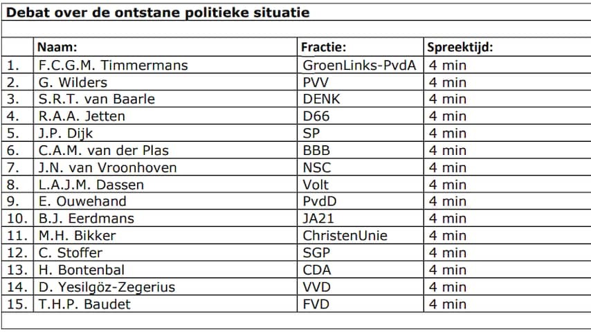 On Behalf of the Caretaker Cabinet, Prime Minister Dick Schoof, Deputy Prime Minister Sophie Hermans (VVD) and Deputy Prime Minister Mona Keijzer (BBB) ​​are present at the debate.