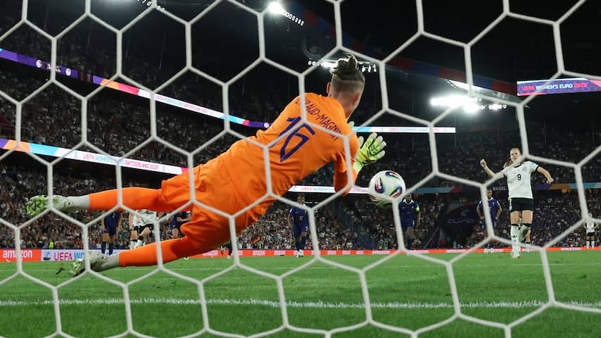 De knappe redding van Mignan in beeld. Het staat nog altijd 1-1, terwijl Duitsland al sinds de 15e minuut met tien speelsters op het veld staat.