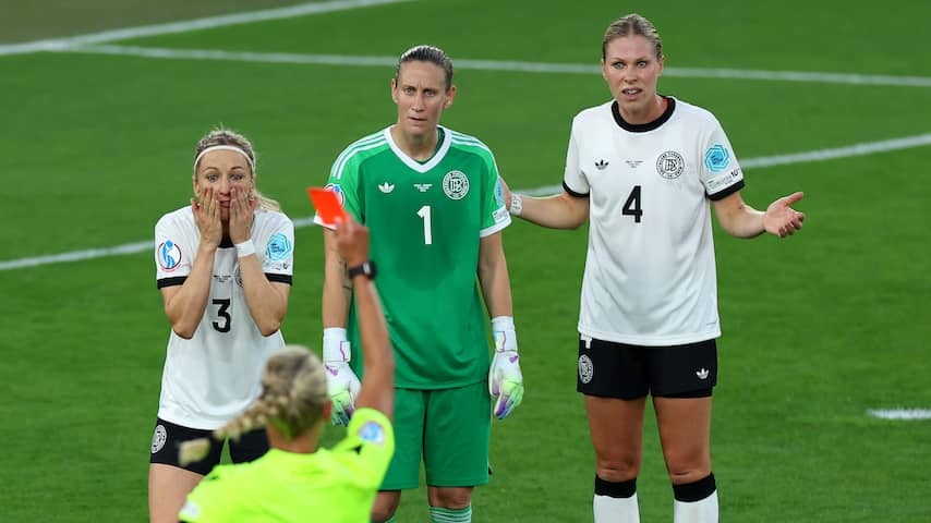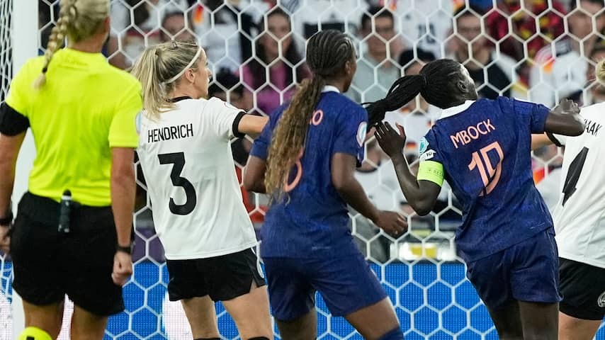 Hendrich, die Mbock aan haar haren trok, weet niet wat haar overkomt. De 33-jarige verdedigster is een van de routiniers van de Duitse ploeg, maar gaat in deze cruciale wedstrijd de fout in. Dit krijgt nog wel een staartje.