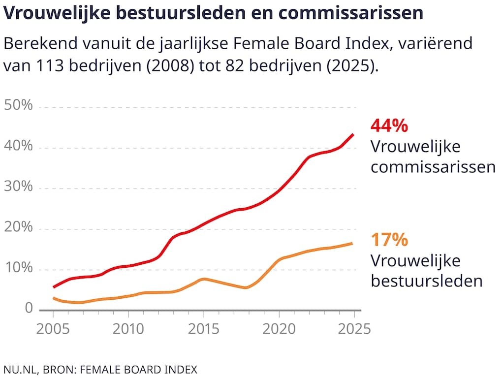 Of the 82 listed companies that the Netherlands has, 85 percent have enough women at the top this year. Last year that was 89 percent. This is evident from the Female Index Board 2025 , an annual study by the Tilburg professor Lückerath.