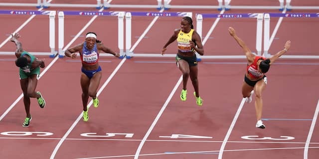 Olympic Champion Masai Russell finished just off the stage Due to a dramatic start. The American Finished Fourth in 12.44.