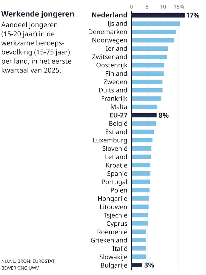 Of the total number of working people in the Netherlands, 17 percent are between 15 and 25 years old. This Amounts to 1.7 Million Young People in the Second Quarter of this year, Accordination to Figures from Eurostat.