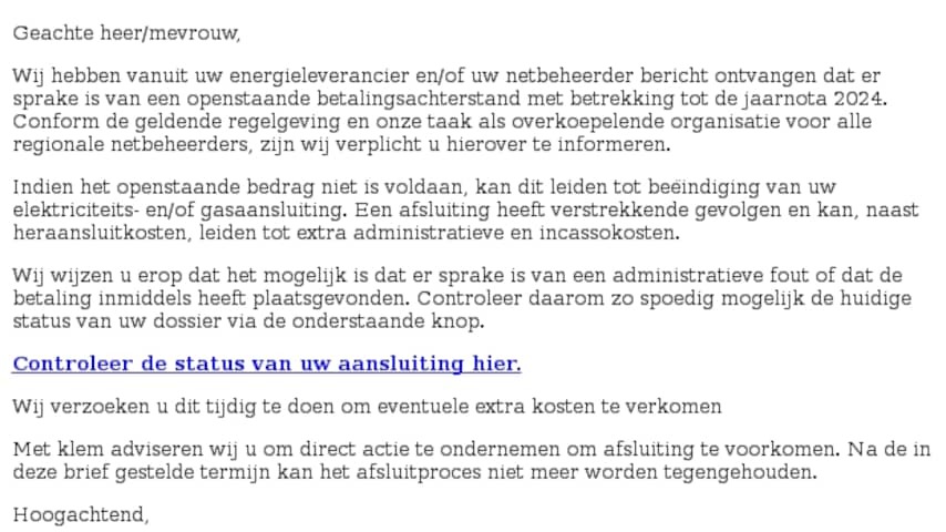 The email contains a link to a webpage that resembles the site of Netbeheer Nederland. Victims are asked to enter data there. “As an industry organization, we never ask for money and do not disconnect people from the grid,” the spokesperson Emphasizes. “Therefore, do not enter any data and immediately throw the email in the trash.” This is what the email looks like: