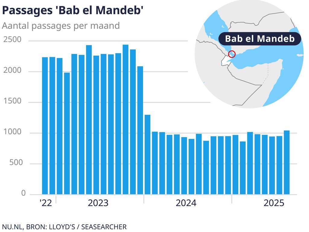 “Most Ships Under the Dutch Flag are currently not Sailing Through the Gulf of Aden and the Red Sea,” Says Cathelijne Bouwkamp of the Royal Association of Netherlands Shipowners (KVNR), which does not keep precise figures. The Trend is also visible international. Before the end of 2023, AN Average or 72 to 75 Ships per day passed bab el Mandeb, Where the Red Sea Turns Into the Gulf of Aden. This Summer, There Were Only 26 to 37 per day.